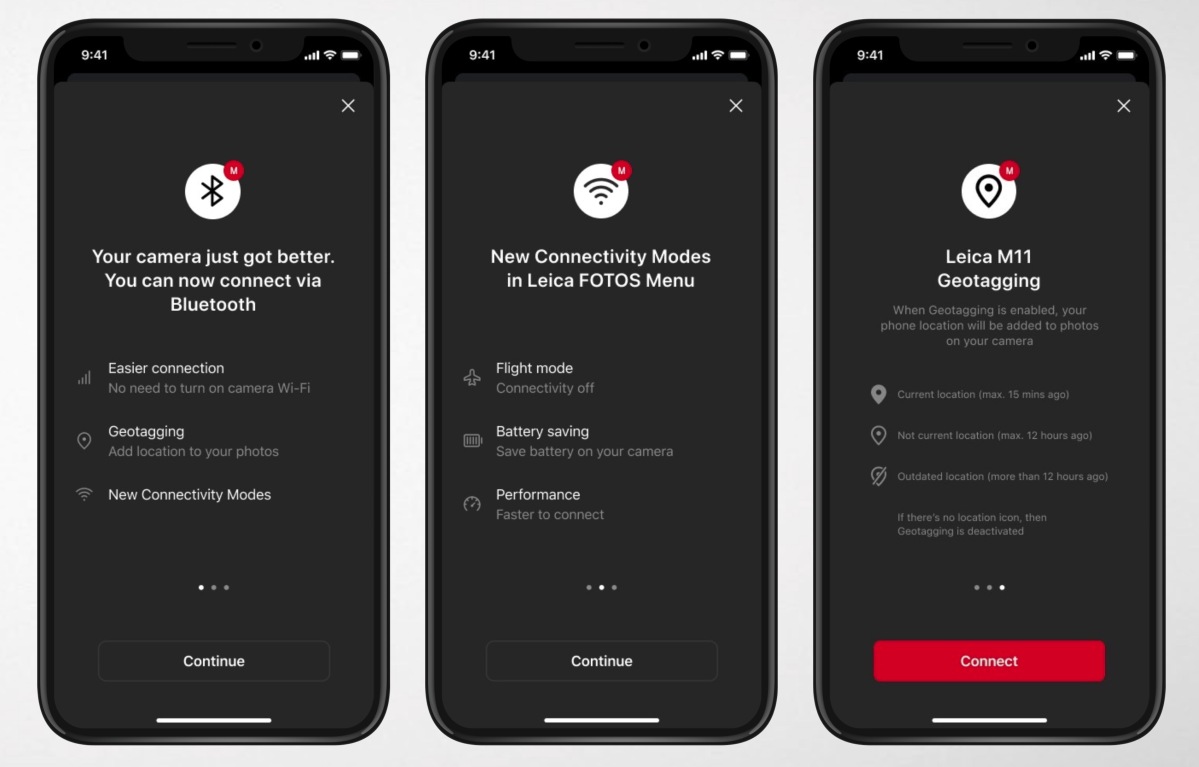 The M11 Monochrom is an Apple ‘Made for iPhone and iPad’ Certified accessory. To receive this certification, Apple ultimately signed off on the camera and its supplied cable to work seamlessly with iOS devices. Leica released v1.6.0 firmware in late 2022 to make the most of this enhanced connectivity with the Leica FOTOS app, including location data-based geotagging, access via Bluetooth, increased data transfer rates and the ability to update camera firmware via the app. Make sure to stay on top of firmware and FOTOS app updates to take advantage of the latest features and improvements.