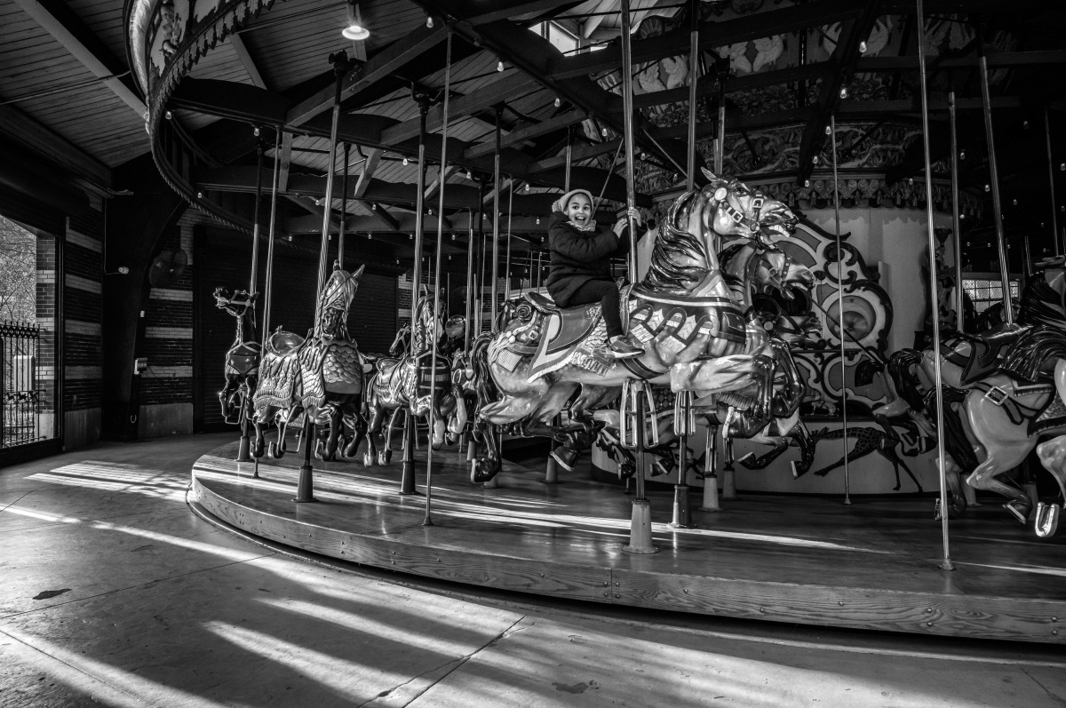 Unfortunately, my next shot was thwarted. I had done my research and saw that Pebble Beach in Brooklyn Bridge Park was an ideal vantage point for a classic skyline composition. With the historic Jane's Carousel in the foreground and the Brooklyn Bridge spanning across the frame with the city behind, it would have been a perfect shot. But I can't show it…because I couldn't take it. There was an ugly construction barge parked right in the middle of the foreground, blocking the carousel. Instead of a wide angle, I changed to the 50mm and cut out the offending barge for a little tighter composition.