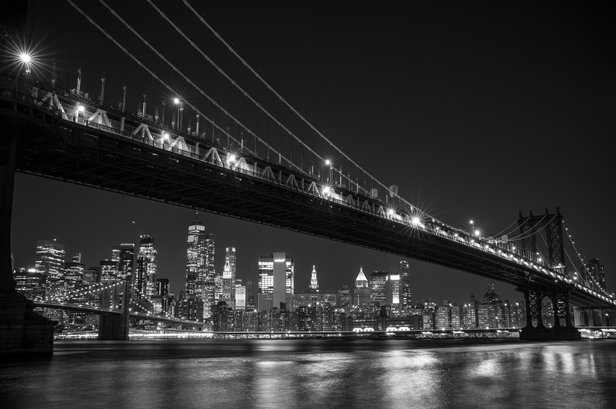 After the gym, I walked back out into the cool night air. City skyline shoots were next on the agenda. I started in the park just a couple blocks away, photographing the Manhattan Bridge, with the Brooklyn Bridge and downtown behind it. Wanting to blur the choppy East River a bit, I realized that while I had packed a tabletop tripod in my bag, I didn't bring any ND filters. But I did have a red filter, and that would act similarly to a 3-stop ND. Popping the filter on, I was able to get 15-30 second exposures at f/8, which worked quite nicely.