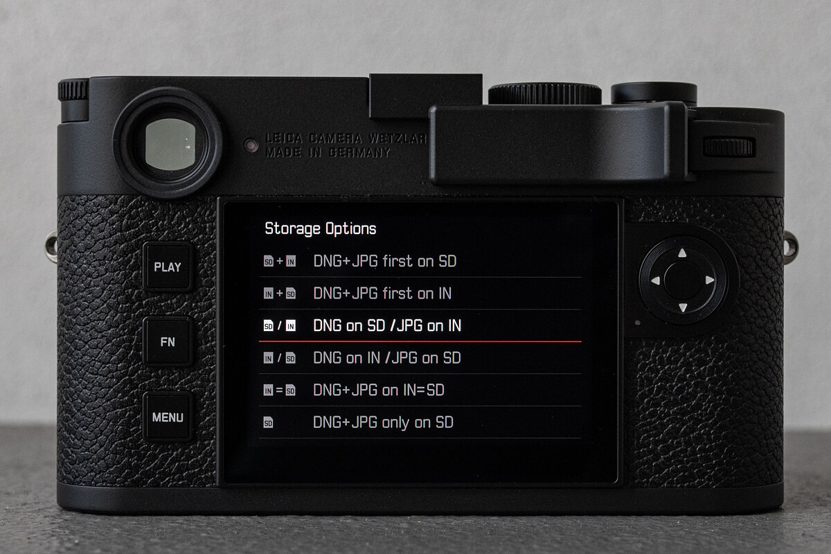 Beyond the covering-your-butt duty, Leica has added in some extra functionality. Due to space constraints in the slender M body, there simply isn’t room for a second SD card slot like in the SL2 and SL2-S. But you can set the camera to utilize the built-in memory like you would a second card slot. Use the default DNG+JPG first on SD setting to take advantage of the extra capacity once the SD card is full. The status menu display will show you the total combined capacity of your SD card and the internal memory. Or, select the DNG+JPG on IN=SD option to record a backup copy to the internal memory. If you shoot DNG+JPG, you can opt to saveDNG files to the internal memory and JPGs to the SD card with DNG on IN / JPG on SD or vice versa with DNG on SD / JPG on IN. And if you simply don’t want to mess around with the internal memory, select DNG+JPG only on SD. Here, the internal space will be ignored, flagging you when your SD card is full. The nomenclature in this menu can be a little confusing with all the options showing DNG+JPG, even if you have the camera set to shoot DNG only. Rest assured that your file format setting is not dictated by your storage setup.