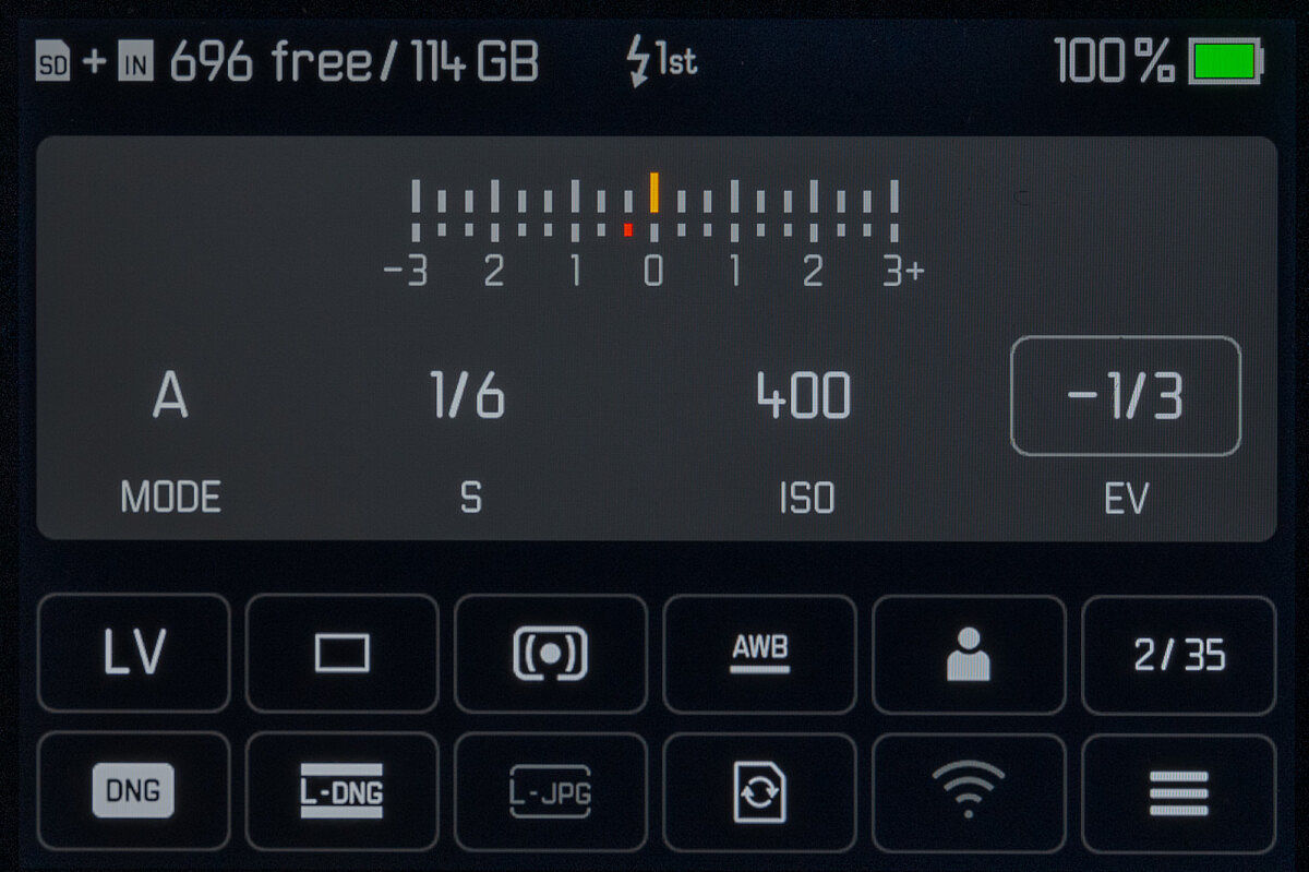 A subtle yet wonderful change that could easily go overlooked is the now clickable rear thumbwheel. Assignable to a custom function, Leica was able to add this additional control without cluttering up the minimalist design. Just like the rear FN button and top button, a long press brings up a list of selectable functions and a short press activates that option. During my testing, I assigned it to bring up exposure compensation, then used the wheel to quickly adjust. If you’re more inclined to have direct and nuanced control over ISO than the large whole steps on the dedicated ISO dial, you could assign M-ISO to the thumbwheel and have far more precise 1/3 steps. Or, for both functions, use the Customize Wheel menu to set the wheel to Exposure Compensation, then long-press to assign it to M-ISO. In this scenario, simply rotating left or right directly changes EV, but a short press in will activate the M-ISO menu on screen so you can select an ISO. Choices, choices.