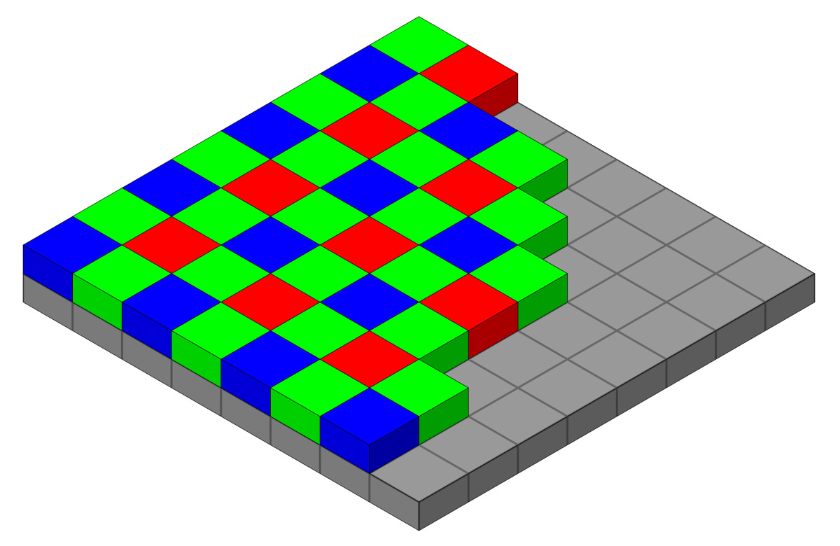 Sensors in digital cameras are inherently monochromatic capture devices. Color recording is only possible by employing a Bayer color filter array over the sensor, which is comprised of a pattern of red, green and blue filters. This means that each pixel can only capture luminance data for one color channel. The missing information is then filled in by a complex algorithm, called demosaicing or debayering, which does an excellent job guessing the color from surrounding pixels.