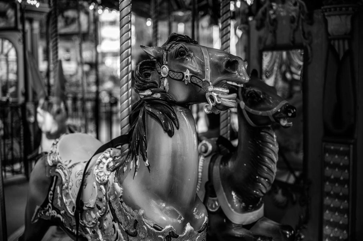 Unfortunately, my next shot was thwarted. I had done my research and saw that Pebble Beach in Brooklyn Bridge Park was an ideal vantage point for a classic skyline composition. With the historic Jane's Carousel in the foreground and the Brooklyn Bridge spanning across the frame with the city behind, it would have been a perfect shot. But I can't show it…because I couldn't take it. There was an ugly construction barge parked right in the middle of the foreground, blocking the carousel. Instead of a wide angle, I changed to the 50mm and cut out the offending barge for a little tighter composition.