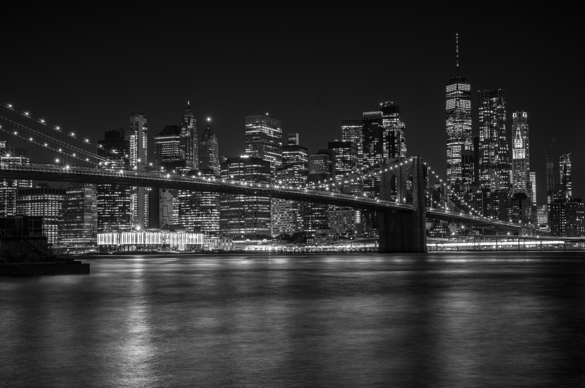 After the gym, I walked back out into the cool night air. City skyline shoots were next on the agenda. I started in the park just a couple blocks away, photographing the Manhattan Bridge, with the Brooklyn Bridge and downtown behind it. Wanting to blur the choppy East River a bit, I realized that while I had packed a tabletop tripod in my bag, I didn't bring any ND filters. But I did have a red filter, and that would act similarly to a 3-stop ND. Popping the filter on, I was able to get 15-30 second exposures at f/8, which worked quite nicely.